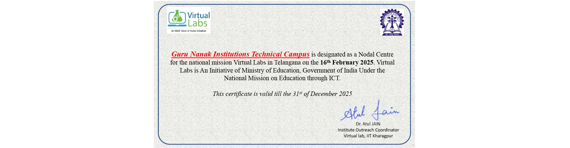 Guru Nanak Institutions Technical Campus is designated as a Nodal Centre for the national mission Virtual Labs in Telangana on the 16th February 2025. Virtual Labs is an initiative of Ministry of Education, Government of India under the National Mission on Education through ICT. Dr. S. V. Ranganayakulu, Dean - R&D, served as the Chief Coordinator of the Nodal Centre, playing a pivotal role in mobilizing and guiding the respective departments to successfully execute the workshops